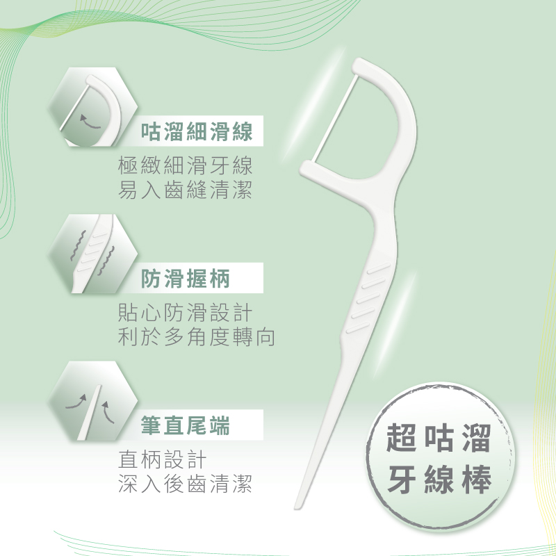 超咕溜的牙線棒使用方便衛生,能深入牙縫,去除牙刷清潔不到的地方。採用高韌性超極細滑牙線材質,牙線更易於滑入緊密的牙縫 間。產品不易斷裂、不易卡牙、 不易起毛、不易抽絲、能輕鬆進入牙縫不費力,使用時不損傷牙齦,能幫助自然清新, 不會因為殘留的食物殘渣發酵而產生異味,幫助減少酸性物質的產生,是您口腔保健的最佳選擇。